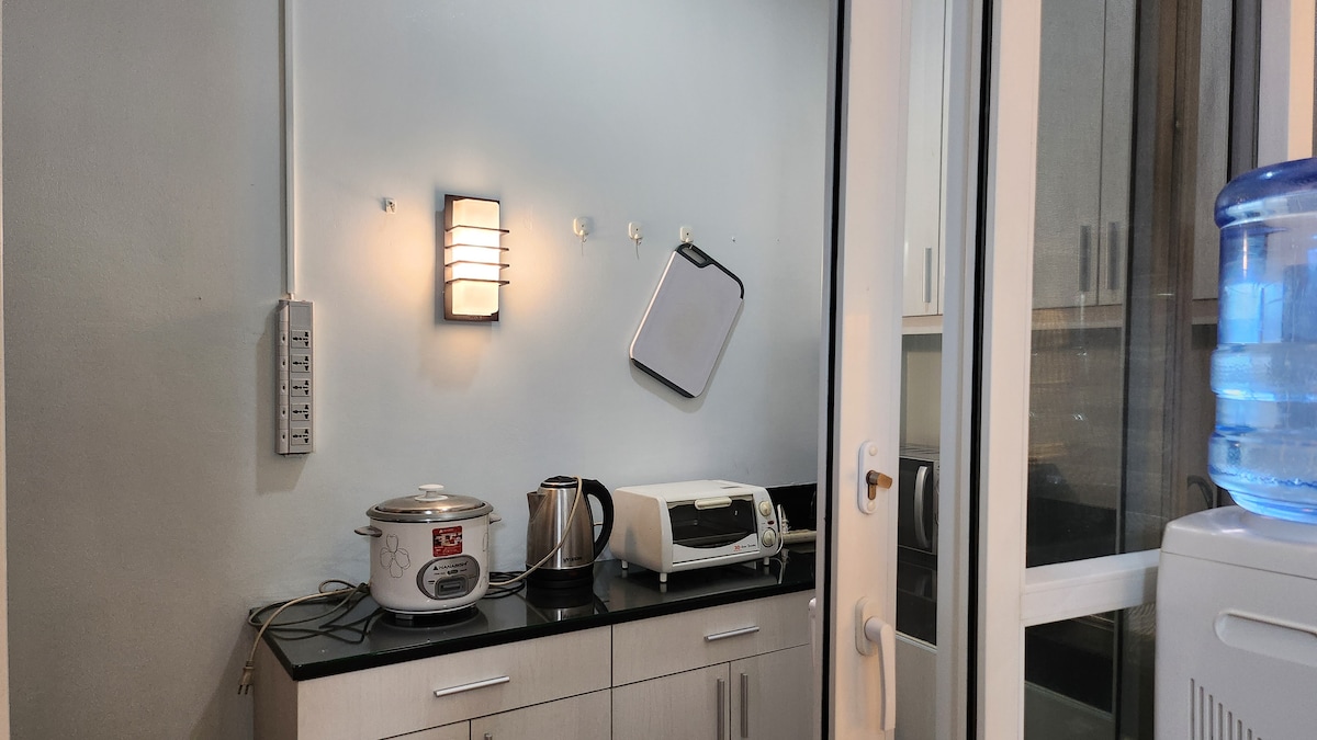 Doživite popolno mešanico domačega udobja in hotelskega razkošja, kjer so vaša sprostitev, užitek in udobje naše glavne prednostne naloge. Prvotno zasnovano kot 2-sobno stanovanje, smo to enoto spremenili v enosobno suito z balkonom, ki ponuja prostorno dnevno sobo in jedilnico. V celoti opremljeno stanovanje v Quezon Cityju je v celoti opremljeno stanovanje v Quezon Cityju na voljo za dnevni, tedenski ali mesečni zakup, kar je idealno za vaše naslednje bivanje.