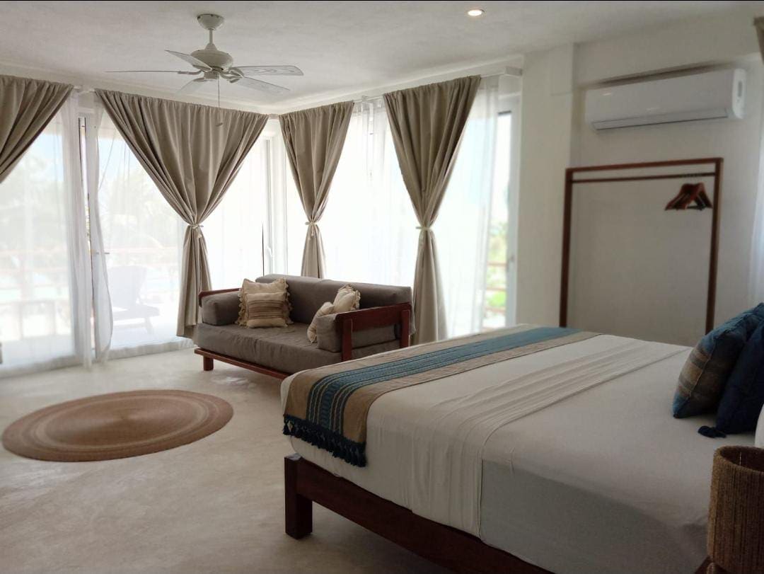 Čudovita dvoposteljna suita s pogledom na ocean, prostorna, udobna in elegantna za družino ali prijatelje. Ta soba izstopa po svoji neverjetni terasi, ki vam nudi najboljše sončne vzhode v Mahahualu.