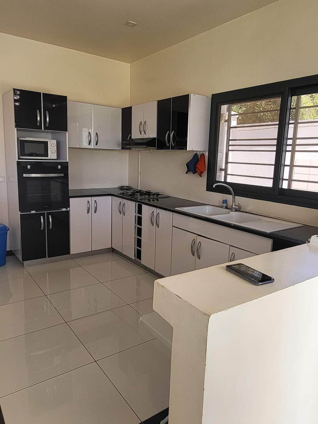 Quartier résidentiel sécurisé pour 5 personnes. 3 chambres à coucher dont 2 climatisées (voir plus de détail dans l'annonce). Appartement de Standing sur 2 étages entourés des balcons et Terrasse vue sur mer. Terrasse supplementaire sur le toît de 75 m² avec vue surplombant sur la baie
