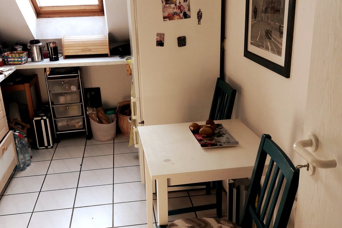 Das gemütliche Zimmer im Dachgeschoss mit Blick auf Weinberge ist möbliert mit Doppelbett (1,40/2,00 m) , Kommode, Schreib- und Seitentisch, Stuhl, Sitzbank und Smart-TV. Gemeinsam nutzen wir Bad / WC, die gut ausgestattete Küche sowie den geräumigen Kleiderschrank im Flur. Nicht zur gemeinschaftlichen Nutzung gehören Wohnzimmer und Balkon. Da ich die meisten Wochenenden nicht im Haus bin, kann mein Gast auch diese Flächen nutzen, sofern ich ihm vertrauen kann. Ein Leihfahrrad steht bereit.