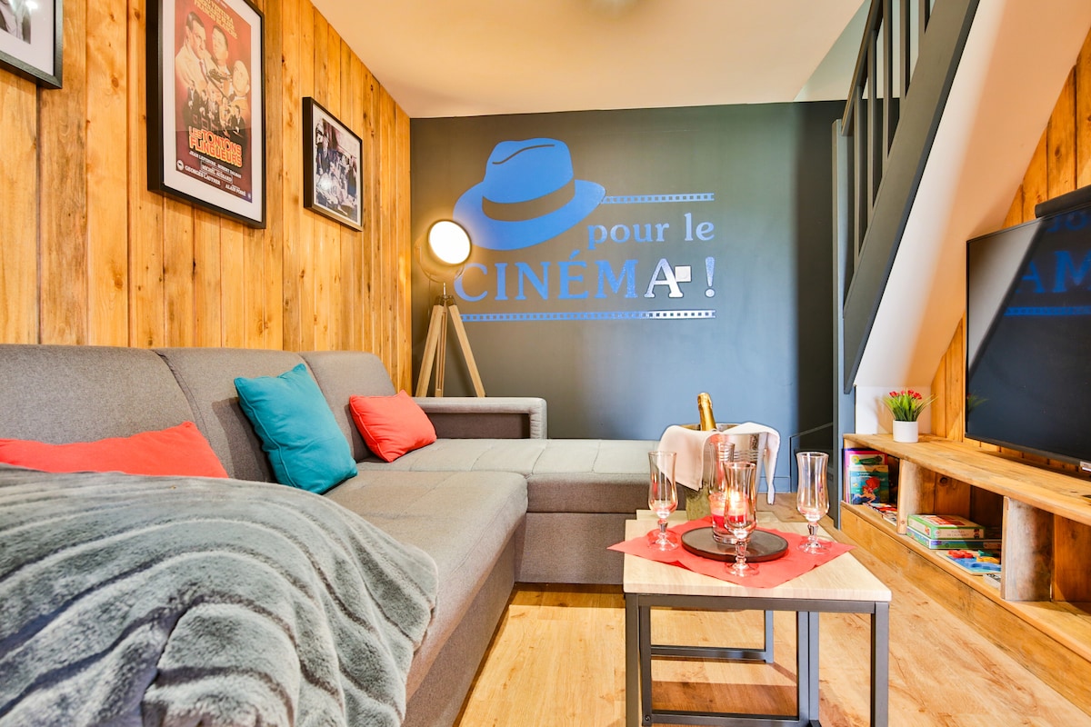 Ce chalet climatisé se situe à 10min du Zoo de la Flèche et à 30 min du circuit des 24h du Mans, vous attend dans une ambiance cinématographique. Dans le salon, canapé, un écran plat connecté de 55 pouces et une barre de son. A l’étage, 2 chambres doubles et un coin nuit, une des deux chambres est équipée d’un écran plat connecté et d’un lit Queen Size (160 X 200m) pour une capacité totale de 5 personnes. Une terrasse ombragée, table, banc et chaises et un salon de jardin privatif.