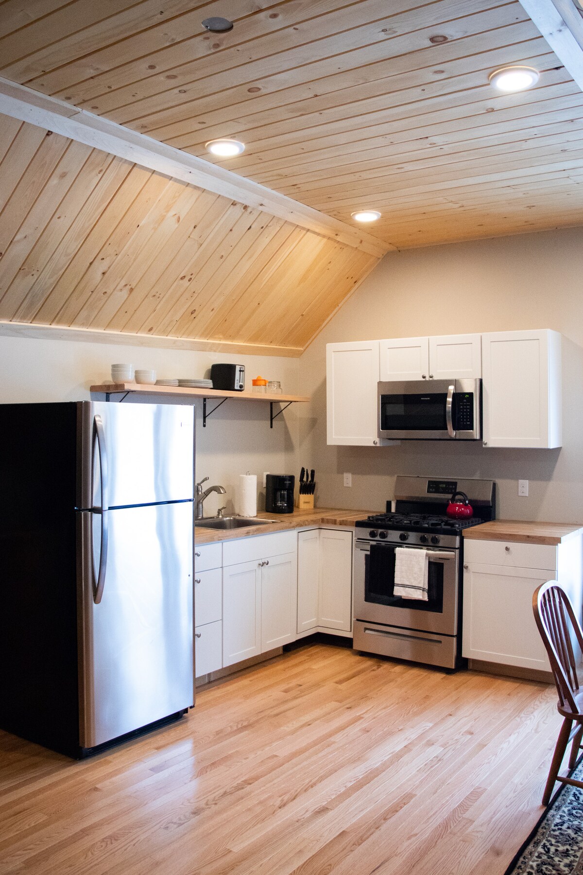 Ta novejša hiša ima zasebno nadstropje 1-BR z zasebnim hrbtom z dnevno sobo, polno kuhinjo z otokom za 2 osebi, veliko kopalnico z dvojno prho in velikim pogledom na reko Sunday River ter Mahoosuc Notch. Kot nalašč za dvosobni oddih v zahodnih gorah ME. Odlično za zimske športe v Sunday Riverju ali Mt. Abrams, dejavnosti na prostem ali hiter dostop do središča Betela. Sprejme lahko do 2 gosti na našem parkirišču z več kot 9 hektarji. A/4WD je obvezen pozimi