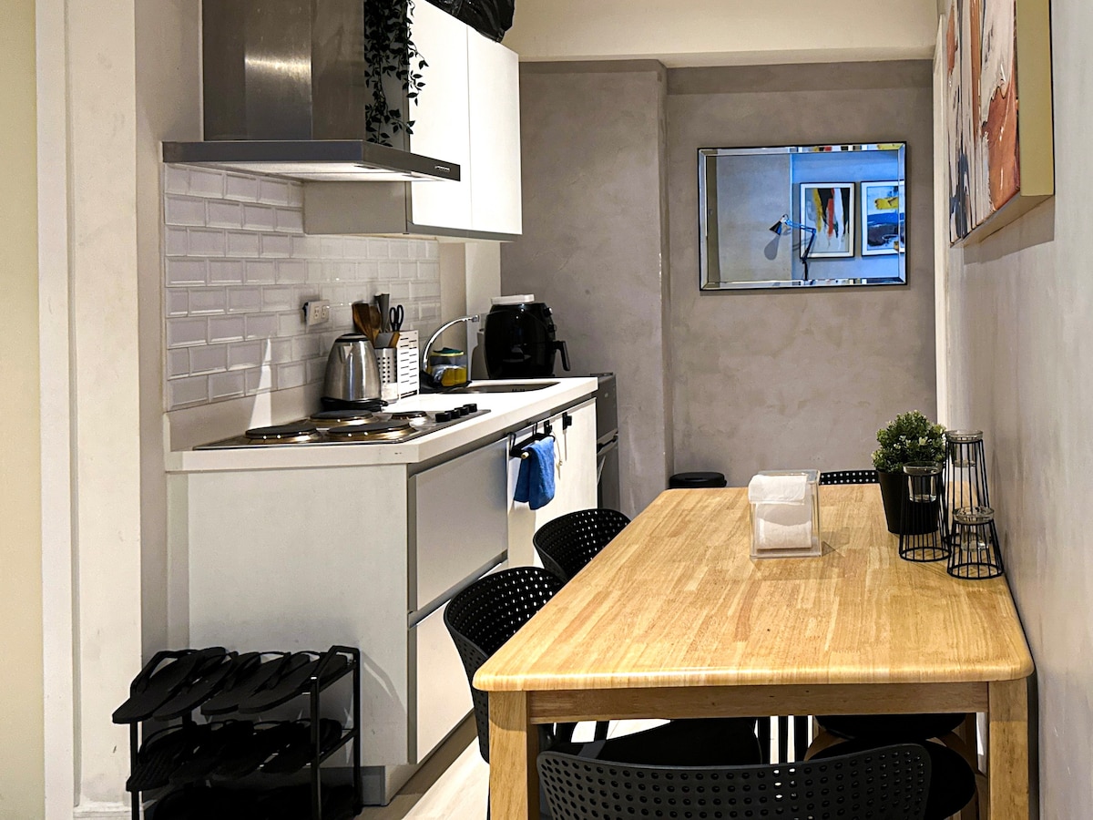 The location is just a walking distance to SM Bicutan and its only 15 minutes away from NAIA 1, 2 and 3. The rate is good for 2 but additional person is allowed up to 2 pax. A minimalist place with a touch of nature A great place that offers all you need for a short stay. Sleep like you are just at home. An ambiance of home is what we aim, enjoy your stay with your love ones here. We offer you a stylish, comfortable room, kitchenware, with wifi and smart tv for entertainment.