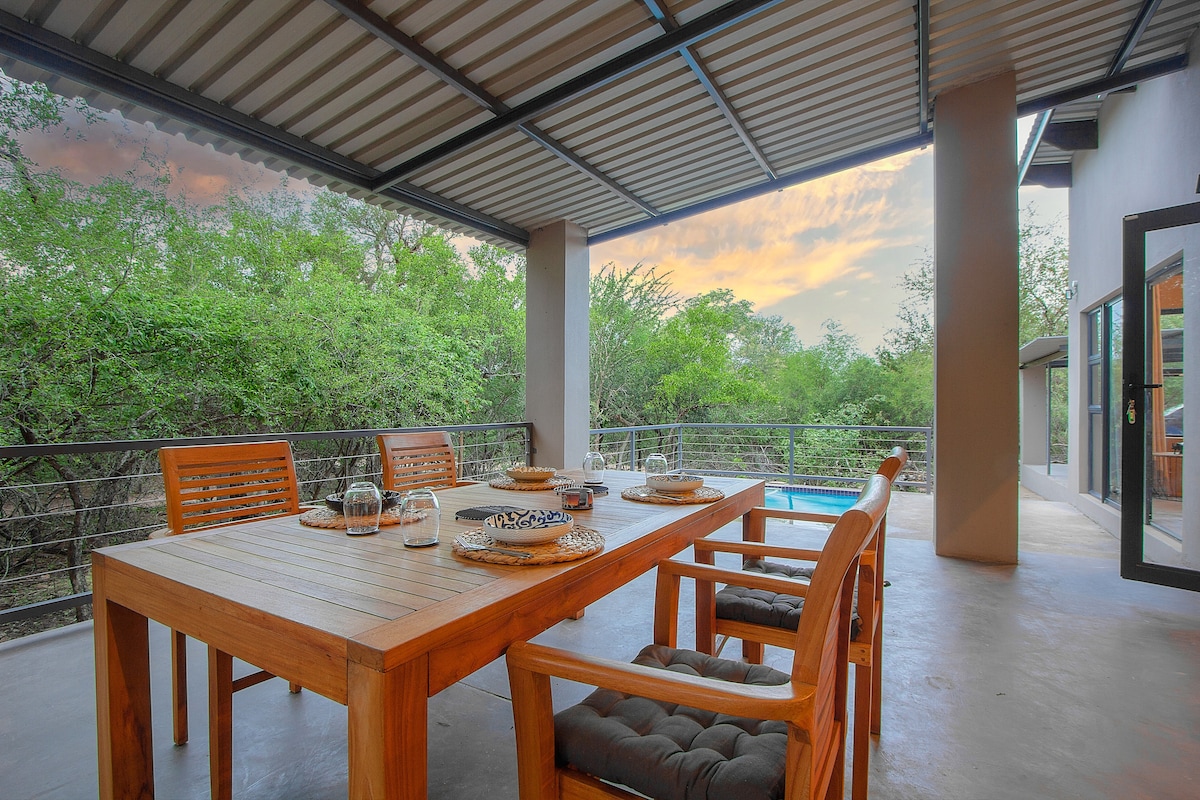 Birdsong je zasebna, samostojna in sončna hiša v ohranjanju prostoživečih živali, ki meji na narodni park Kruger. Sprostite se v spodnjem zunanjem salonu z ogrevanim bazenom, saj se zebra, kudu in številni drugi ustavijo na obisk. Opazujte sončni zahod z viseče mreže na zgornji terasi. Telovadnica v telovadnici. In če preprosto ne morete pobegniti od dela, je zgoraj velika miza s čudovitim video ozadjem! Birdsong je le 15 minut oddaljen od Kruger 's Crocodile Bridge Gate.