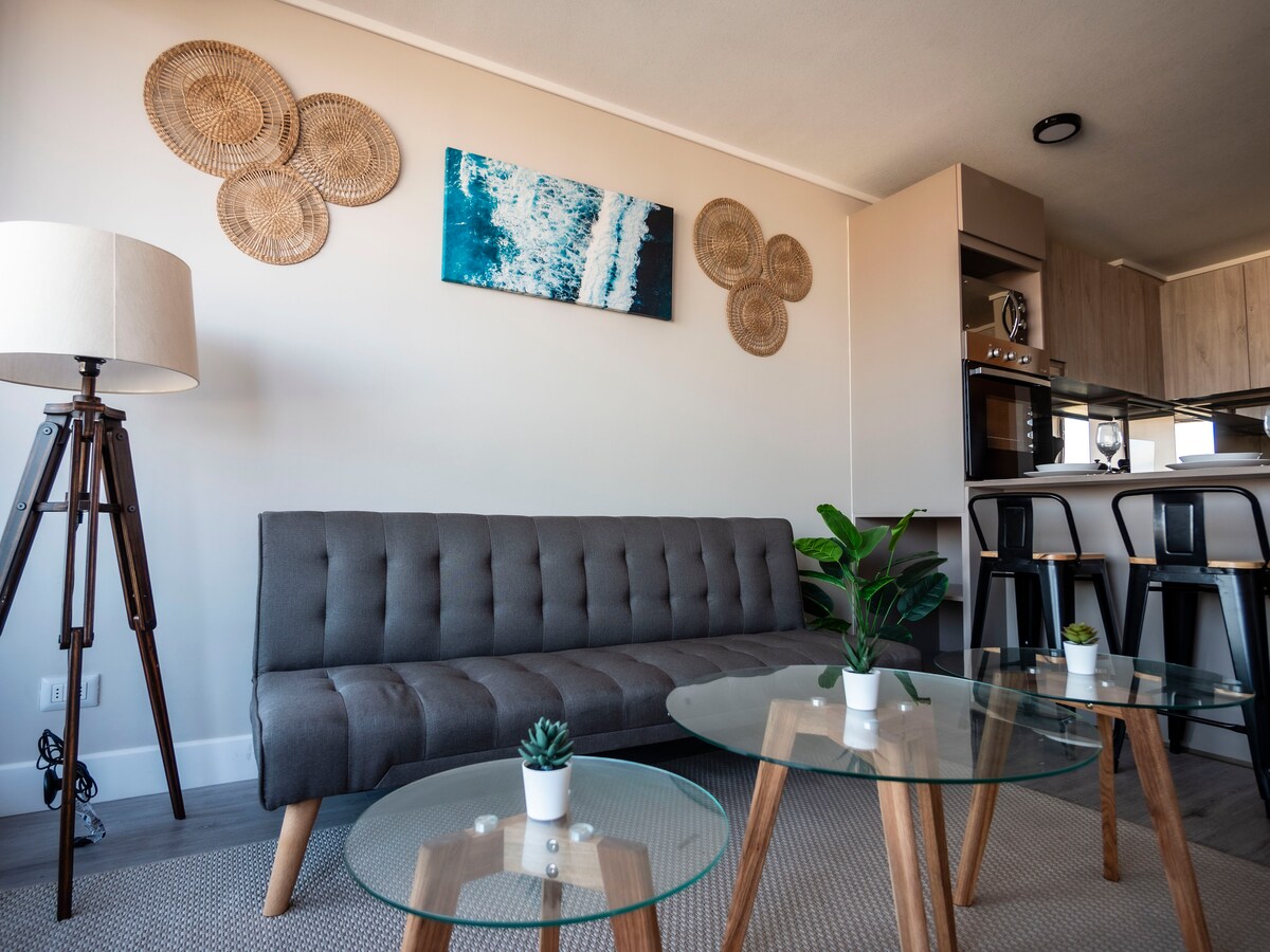 Uživajte v sodobnem in svetlem stanovanju, zasnovanem za pravi počitek. Neoviran pogled na ocean in obalo, udobna postelja, kopalnica s kadjo in popolnoma opremljena kuhinja z vrhunsko opremo. Hitra povezava Wi-Fi in pametni televizor z Netflixom. Vse v bližini: plaže Coquimbo/Serena, Cruz Tercer Milenio, Barrio Inglés, pristanišče in zabava. Idealno za miren oddih v Coquimbu. Elegantno doživetje v tej nastanitvi v središču mesta.
