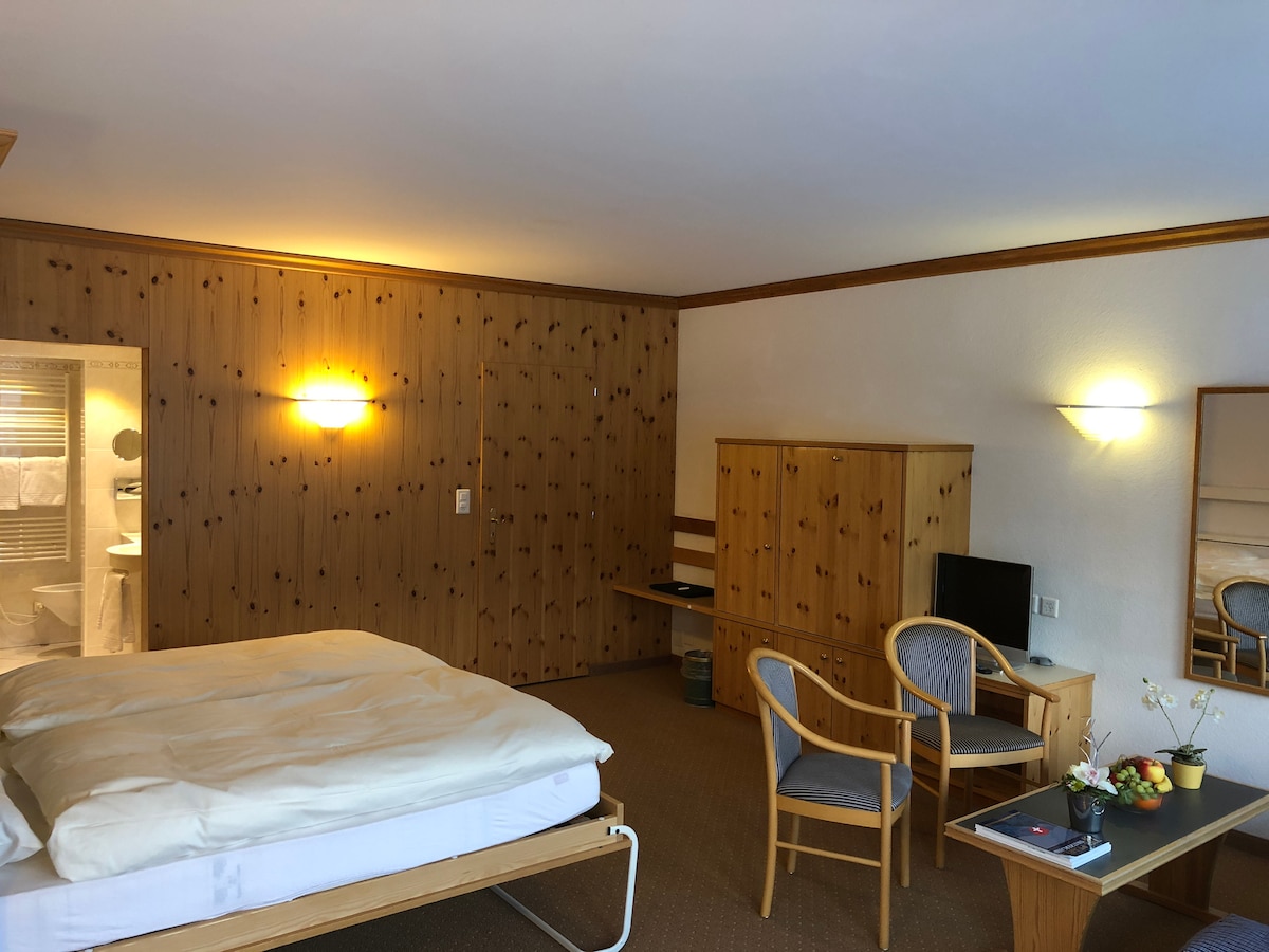 Naša edinstvena 2-posteljna stanovanja (približno 50 do 65 m2) se nahajajo na jugu in ponujajo pogled na dolino Roseg. Dvoposteljna stanovanja so sestavljena iz spalnice in kopalnice ter visokokakovostne in popolnoma opremljene kuhinje s kombinirano dnevno sobo in jedilnico. V naših sobah boste našli prvovrstne vzmetne postelje Schramm, ki zagotavljajo odlično udobje spanja. Tla so izdelana iz hrastovega parketa, spalnice pa so obložene z smrekovimi oblogami. Stanovanja nudijo ložo.