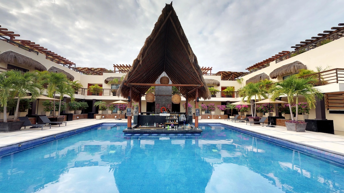 Nahaja se na najlepši ulici z drevesi v Playi del Carmen, z neverjetnimi kavarnami, bari, restavracijami, lokalnimi trgovinami in plažo. To edinstveno + sodobno enosobno stanovanje je blizu vsega, kar olajša načrtovanje vašega obiska. Čez dan se sprehodite do plaže, preživite večer na 5. aveniji ali pa preprosto uživajte v navtičnem stanovanju + zasebni terasi ali pa se odpravite na čudovito streho in uživajte v spektakularnem razgledu na morje, medtem ko uživate v baru in bazenu.