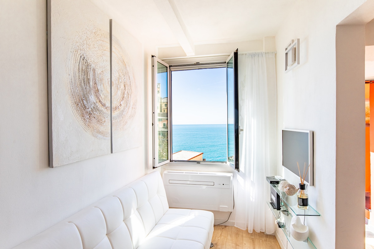 CITR: 011024-CAV0066-IT011024B4TSEULH49 Samostojno stanovanje v zgornjem nadstropju vile, ki se nahaja na skalnati bastiji s pogledom na morje. S teras, ki so potopljene v neverjetno tišino, lahko uživate v edinstvenem razgledu: od majhnega vhoda v marino do prostranstva odprtega morja, od Punta Mesca do vasi Monterosso in Corniglia. Stanovanje z veliko spalnico z zakonsko posteljo, kopalnico, kuhinjo s posodo, rjuhami in brisačami