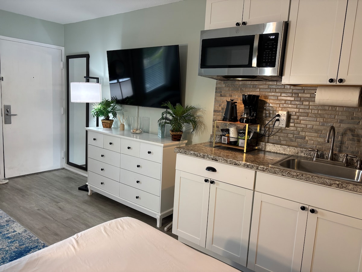Garsonjera v našem hotelu Siesta Key za 1-2 osebi. Vsaka soba ima veliko zakonsko posteljo, 42-palčno televizijo, jedilno mizo in popolnoma opremljeno kuhinjsko nišo iz nerjavnega jekla. Kot nalašč za pare ali samostojne popotnike. Vse naše sobe so bile pred kratkim posodobljene tako privlačne, kot so udobne. King Studio Suites so opremljeni v elegantni obmorski dekoraciji, vključno z udobno teraso s stoli in senčnikom za sprostitev in uživanje v čudovitem vremenu, ki ga ponuja Južna Florida.