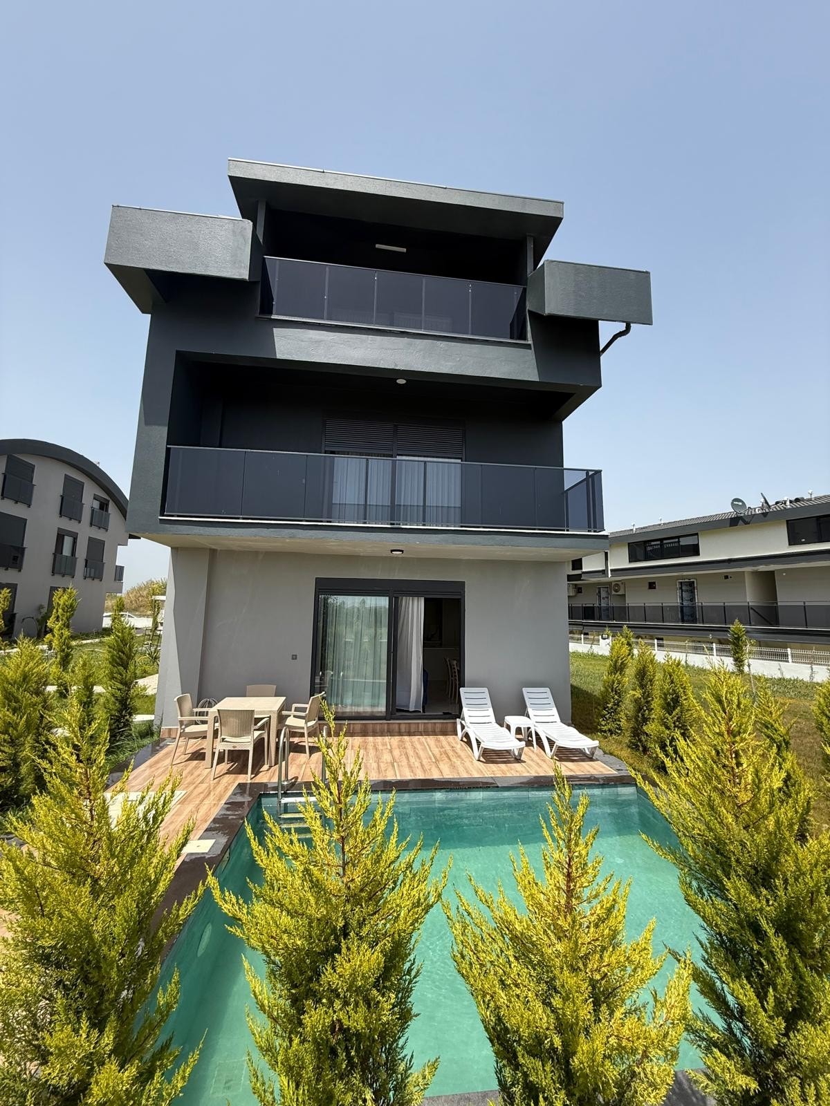 V tem čudovitem kraju lahko uživate v zabavi z vso družino. 3-nadstropna luksuzna vila z bazenom s pogledom na morje ima tudi 3 stranišča in kopalnice, 2 kuhinji, 8 postelj, 2 televizorja, pralni stroj in pomivalni stroj. Do morja lahko pridete v krogu 900 metrov hoje. Parkiranje je na voljo. »Naša hiša je registrirana pri Ministrstvu za kulturo in turizem Republike Turčije.«