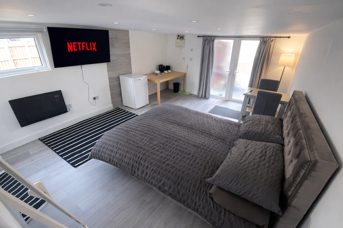 Uživajte v mirni in udobni enosobni garsonjeri v osrčju Old Trafforda. Ta kraj je popoln, če obiskujete Manchester United , stadion za kriket Old Trafford, Trafford Centre in vsa druga večja prizorišča z BREZPLAČNIM parkiranjem in vsemi prometnimi povezavami v bližini 🚌 🚋 Naša hiša za goste je opremljena s kuhinjsko nišo, prho in straniščem ter udobno zakonsko posteljo. Na voljo je tudi jedilna miza, ki je popolna kot delovni prostor ali za uživanje v obrokih. Upoštevajte, da trenutno ni štedilnika.