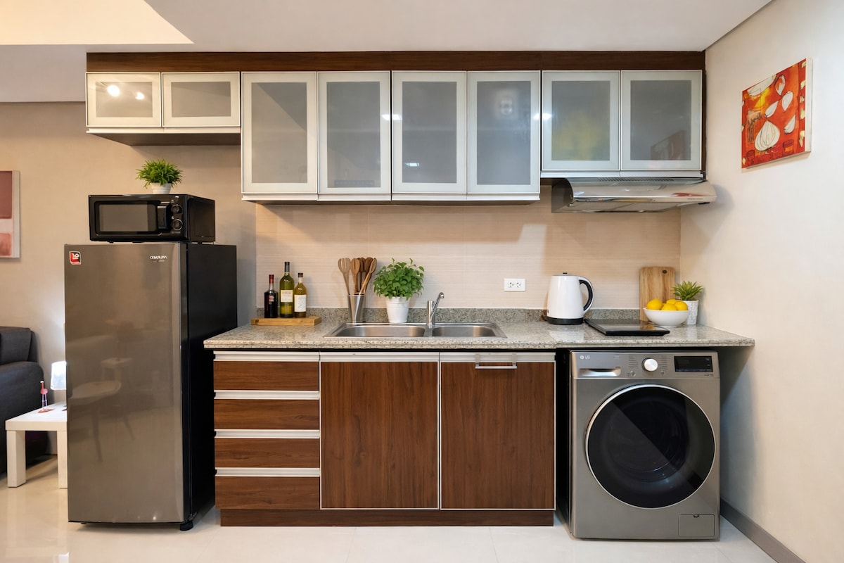 1BR v nakupovalnem središču Uptown Mall BGC z balkonom in pralnim in sušilnim strojem
