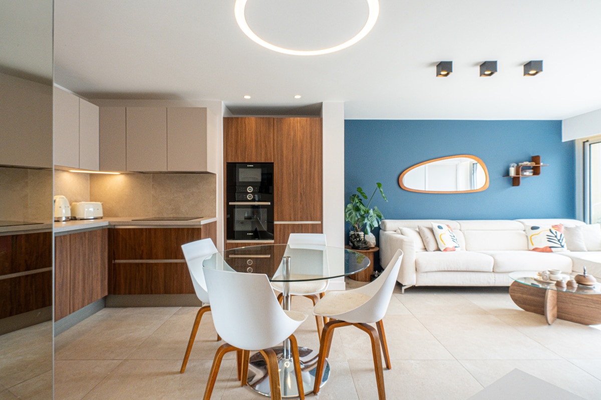 Elegantno, sodobno, popolnoma opremljeno na novo opremljeno dvosobno stanovanje z zasebnim vrtom in zasebnim vhodom, ločenim od glavnega družinskega doma. Stanovanje v bližini vseh potrebščin, supermarketa, restavracij, plaže, gradu, golf kluba, igrišča, marine itd. Idealna lokacija za ogled številnih znamenitosti francoske riviere Cannes, Lerins Islands, Nice, Monaco, St Tropez itd. Na uličnem parkirišču v mirnem stanovanjskem območju tik ob namestitvi. Vrt v skupni rabi z lastniki prijaznimi mačkami.