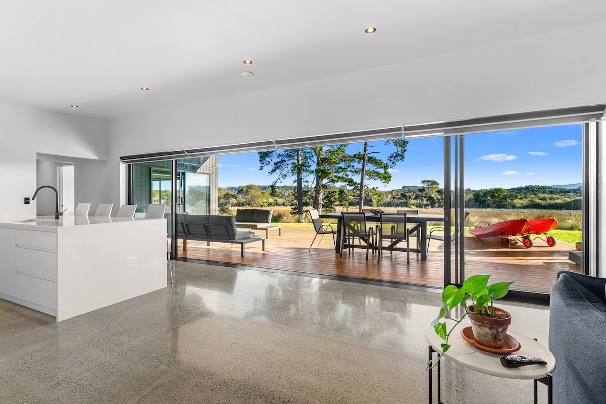 •Sodobna arhitekturno zasnovana bach s sodobno opremo in dekorjem. •sončno in ogrevano. •Spa bazen •Pijte koktajle na terasi ali v spaju, medtem ko opazujete sončni zahod. Raztegljiv pogled na ocean/pristanišče. •Pobegnite iz mesta, delajte na daljavo ali pa se sprostite. Nahaja se v središču mesta, v bližini igrišča za golf in trgovin. •Urejen razdelek Dostop do simulatorja golfa je na voljo na zahtevo po pavšalni strošek v višini 1000 USD/rezervacijo. Oglejte si tudi našo sosednjo namestitev: »Luksuzni pobeg mangawhai«