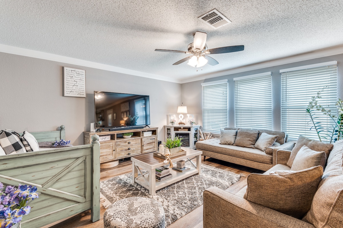 What you’ll ❤️ about your stay: - Centrally-located in the heart of Arlington - Within minutes of AT&T Stadium, Texas LIVE, Globe Life Field, Six Flags, Hurricane Harbor, University of Texas at Arlington, Billy Bob's of TX, Famous Stockyards of Fort Worth, & DFW Airport - 19 min walk to AT&T Stadium - Walking distance to shops, restaurants, & bars - Fire Pit/Grill/Outdoor Dining - Fully equipped Kitchen (pods/coffee provided) - High Speed Internet - (3) Smart TVs - Full-Size Washer & Dryer