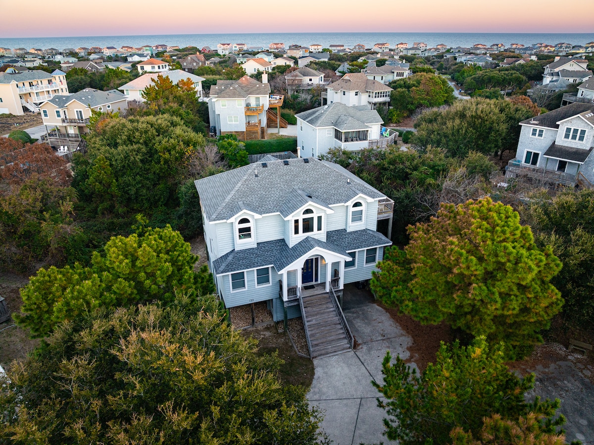 Uživajte v družinski zabavi v igralnici z mizo za namizni nogomet, nato pa se sprostite v masažni kadi ali pa se potite na Pelotonu. Pripeljite svoje najdražje in uživajte v toplem gostoljubju podjetja Good Luck Duck! ✔ 8 minut hoje do plaže ✔ 5 minut hoje do središča mesta Duck ✔ Hišni ljubljenčki so dobrodošli! ✔ spi do 12-6 BR/5 BA ✔ Masažna kad ✔ Peloton ✔ Dostop do opreme skupnosti → 20 minut do nacionalnega spomenika bratov Wright → 25 minut do svetilnika Currituck Beach → 30 minut do državnega parka Jockey 's Ridge → 30 minut do plaž s štirikolesnim pogonom