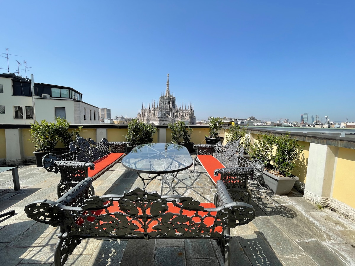 Bright and quiet apartment with a stunning view on the roofs of Milan and the Duomo cathedral, only 5 minutes away from the city centre. The apartment is located on the 8th floor of a fascinating historical building. It's modern design, cosiness, and it's characteristic terrace will guarantee the ultimate comfort during your stay in Milan. Just a few minutes away from the main downtown metro stations ("San Babila" and "Duomo"), Milan has never been easier to explore!