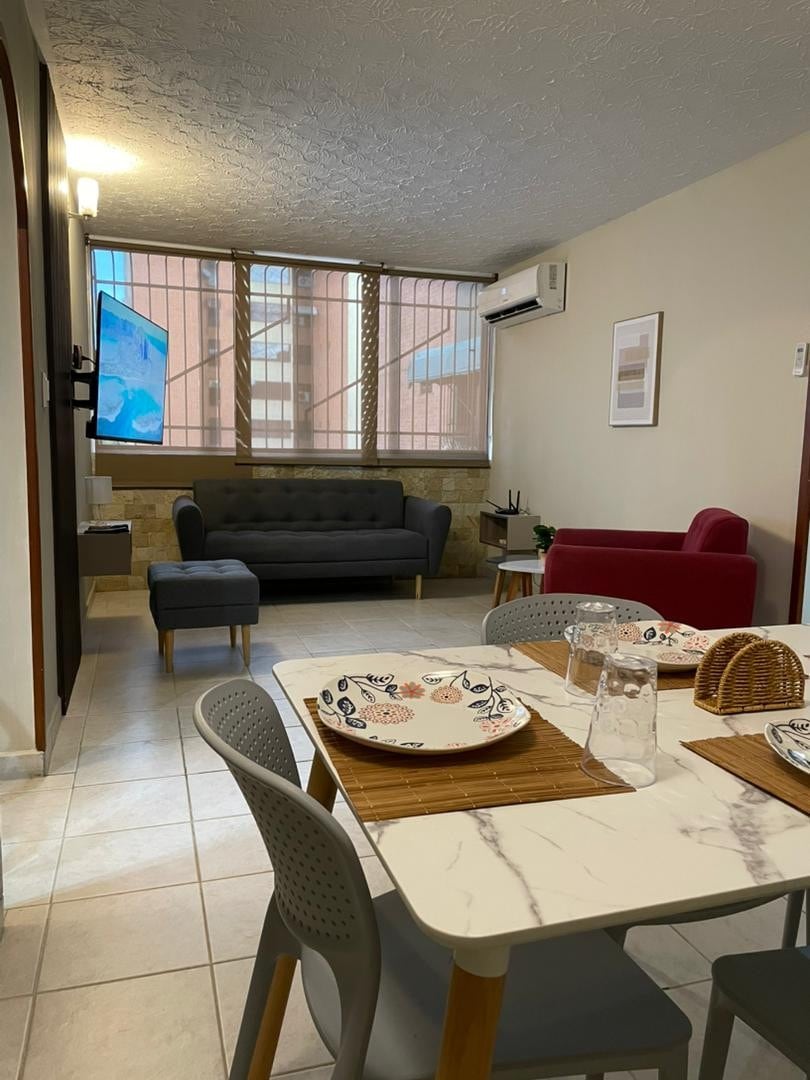 Apartamento familiar muy acogedor, ubicado cerca de centros comerciales, farmacia y supermercados. Completamente amoblado y equipado. Tiene lo que necesitas para una estadía confortable y sentirte como en casa. Cuenta con todos los servicios: internet de alta velocidad por fibra óptica, Smart tv, aire acondicionado en todas las habitaciones, vigilancia las 24 horas, un puesto de estacionamiento y áreas verdes.