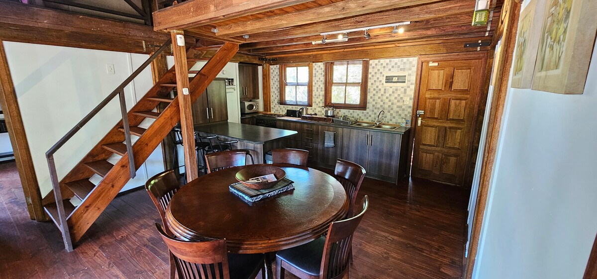 Country living with all the amenities you will enjoy in the city. A secure thatch chalet build from rock. Situated on a 21ha bush veld farm. Lots of bird life Impala, Blesbok and giraffe roaming around. 1 Bedroom with queen size bed and bathroom on suite. Open plan living area with fully equipped kitchen dining room and lounge with queen size double sleeper couch and Dstv. Cool veranda amongst trees. Beautiful terraced garden with (boma) barbecue area. Under cover parking. Pool recently added.