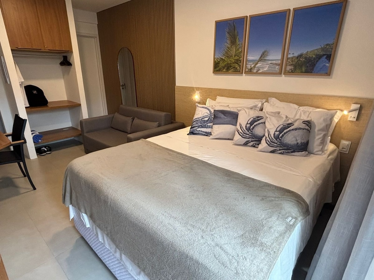 Rezervirajte svoj oddih v Itacaréju. V zatočišču, kjer se sonce poslavlja na obzorju, valovi pa šepetajo starodavne zgodbe, predstavljamo naš očarljivi studio, ki se strateško nahaja v bližini živahne ulice vasi, znane kot Pituba. Tropska nastavitev: Ko prečkate prag, vas pričaka prostorna garsonjera, popolna fuzija modernosti in tropskega poletja. To je prostor z vabljivo zakonsko posteljo in raztegljivim kavčem, kjer se udobje prepleta s slogom.