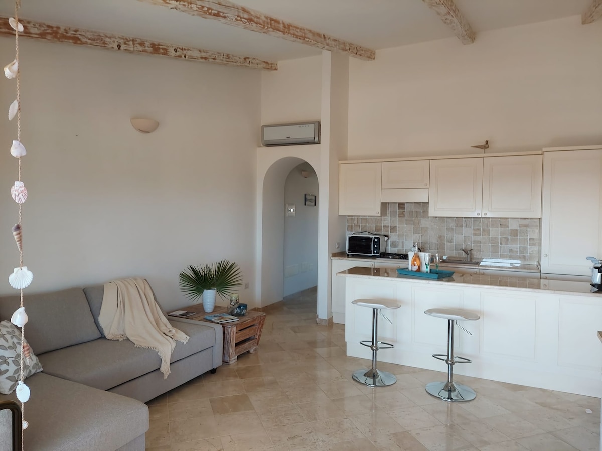 V vasi Porto Quadro, prenovljeno stanovanje, osupljiv pogled na morje, 1 km od plaže in 150 m od pečine. - majhen vrt s delno pokrito verando. - Dnevna soba/kuhinja s klimatsko napravo. - Majhna dvoposteljna soba, brez oken, opremljena s klimatsko napravo. - Majhna kopalnica, s straniščem, bidejem, prho, brez oken. - Velika dvoposteljna soba, brez oken, opremljena s klimatsko napravo in kopalnico v sobi, z WC-jem, bidejem, umivalnikom, prho in prisilnim sesanjem.