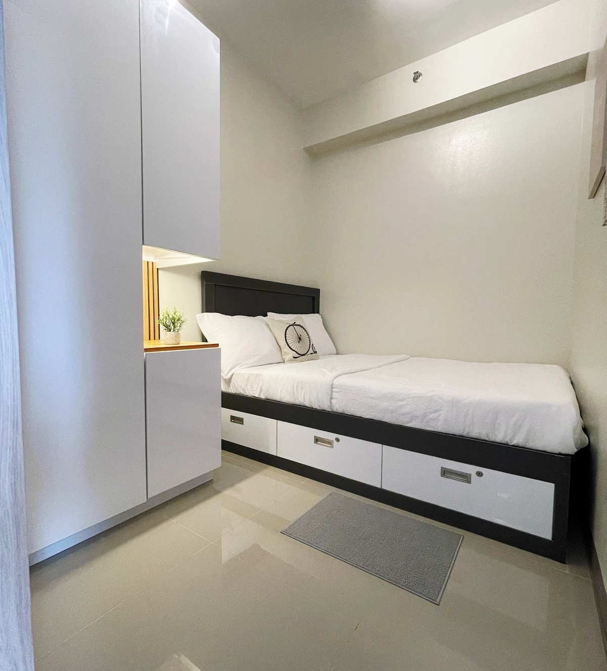 Premišljeno oblikovana enosobna enota v osrčju Marikine. Minimalistično, vendar udobno stanovanje, ki je kot nalašč za pare, majhne družine ali popotnike, ki potujejo sami, ponuja vse osnovne potrebščine za sproščujoče bivanje, vključno s polno kuhinjo, hitrim Wi-Fi-jem, televizijo, ki je pripravljena za pretočno predvajanje, in elegantno notranjostjo. 📍 Strateško se nahaja nasproti nakupovalnega središča Bluewave Mall in le nekaj minut od SNR, športnega kompleksa Marikina in glavnih nakupovalnih središč, kot sta Ayala Feliz in Sta. Lucia.