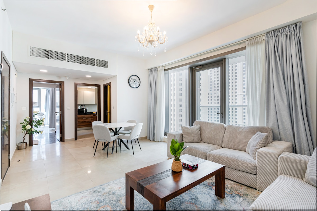 🏖️ Prime Location in JBR Near 🚇Metro, 🚌 Transport & 🛍️Mall 🏡 perfect for families & large groups 🍽️ Fully Equipped Kitchen 🏊♀️ Pool & 🏋️Gym Our apartment is just a 3-minute walk to the beach, perfect for sun☀️, sand and beach🏖️ lovers! 🛏️ Spacious 2-Bedroom Apartment which comfortably accommodates up to 9 guests 💻Work & Stay Connected Enjoy a dedicated working desk 👶 Baby cot & High chair for little ones! 🎬Roxy Cinema is just a short stroll away for a movie night in JBR🍿