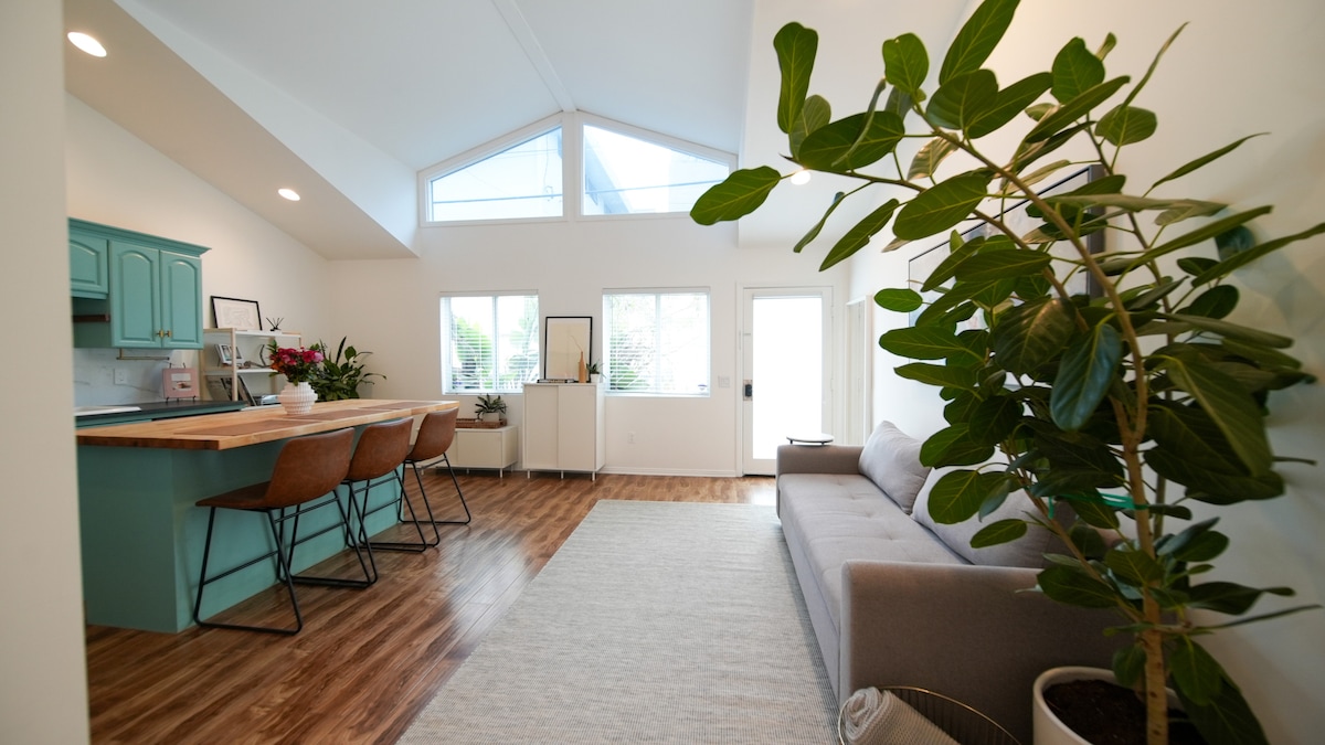 Počivališče. Varno, očarljivo, 1 na novo prenovljena hiša za goste z 1 spalnico v stanovanjskem območju Kentwood v Westchesterju. Parkiranje na ulici je preprosto. Univerza LMU, supermarketi in ugodnosti v soseski so v hoje. Letališče LAX, plaža Playa Del Rey in stadion SOFI so oddaljeni 10 minut vožnje. Vozite severno ob obali do letališča MDR, Venicea in Malibuja. Odprta dnevna soba s kuhinjo z vsemi potrebščinami. Dnevni prostor se odpira na zasebno zunanjo sedežno površino. Pogled na zunanjost iz spalnice. Skupni jedilni prostor za 6 oseb/žar.
