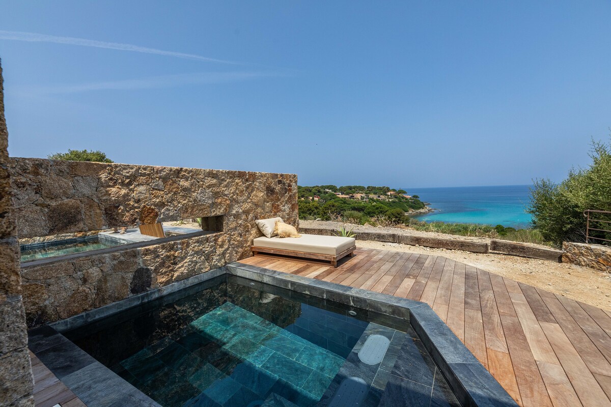 Korzikanski dvoetažni apartma s pogledom na morje in majhnim bazenom.