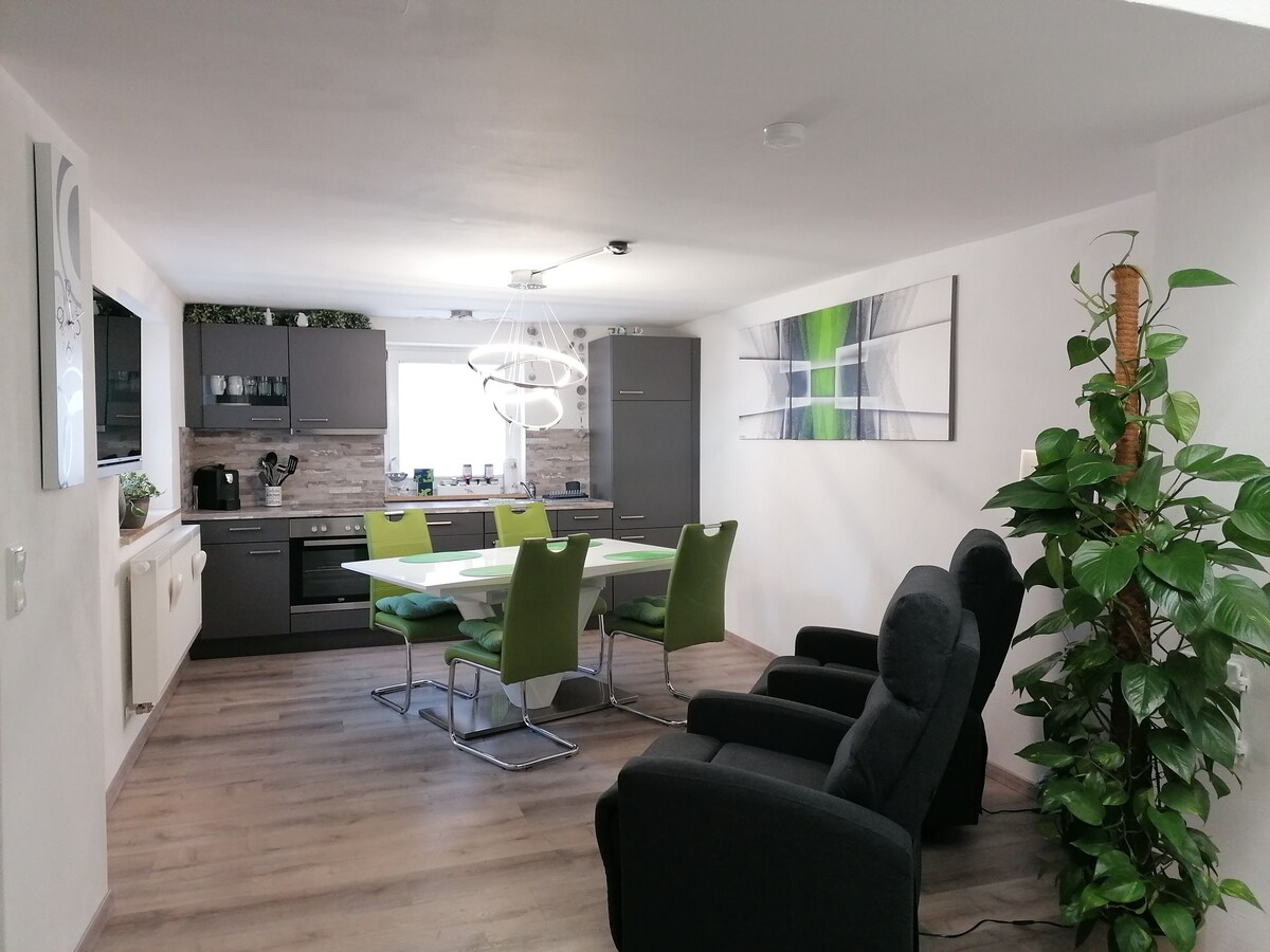 Dobrodošli v stanovanju "Into the Green". Nastanjen v čudoviti pokrajini južnega Steigerwalda, vas kraj miru čaka, da se sprostite in upočasnite. Za naše stanovanje uporabljamo samo naravne materiale, za zdravo notranjo klimo in zelen odtis. Zgrajena v 19. stoletju, stavba je bila ljubko obnovljena s strani arhitektov in je del slikovite posesti s številnimi starimi drevesi.