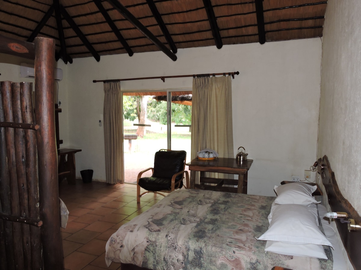 Sodobna soba se nahaja v rezervatu prostoživečih živali v parku Marloth Park, naša koča pa je neposredno v bližini parka Kruger. Na vrtu lahko opazujete številne živali, kot so opice, antilope in fantastično lepe ptice. V prenočišču Boma (zaščiten prostor za žar) je tradicionalni braai (južnoafriški žar). V ogrevani zunanji masažni kadi se lahko sprostite, medtem ko uživate v razgledu. Ta soba je edina soba v naši koči z lastno teraso.