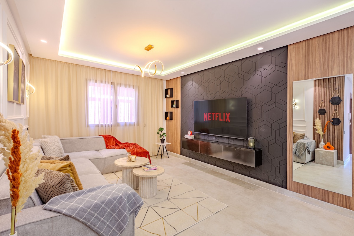 Studio moderne et élégant avec rétroprojecteur privé pour une expérience cinéma depuis le lit. Ambiance cosy, décoration soignée et literie haut confort. Le logement dispose d’une cuisine équipée, TV et climatisation. Idéalement situé à 2 minutes du centre, 10 minutes de Jemaa el-Fna et 15 minutes de l’aéroport, il offre un cadre chic et pratique pour un séjour relaxant à Marrakech. Séjour interdit aux couples marocains non mariés.