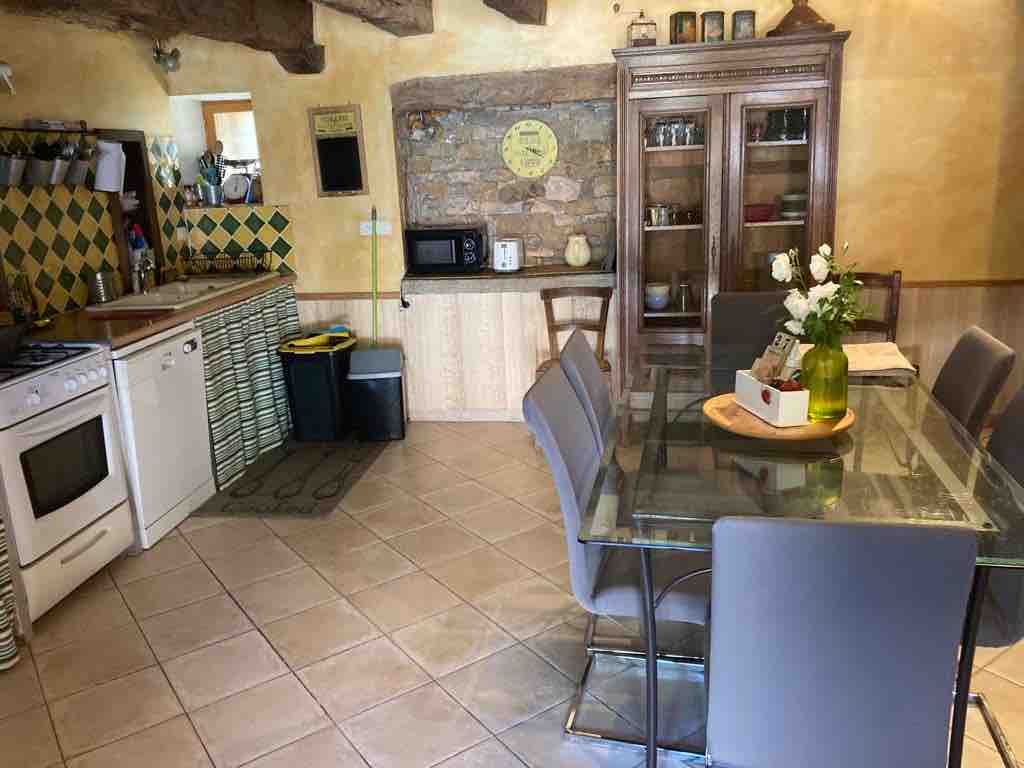 Samostojna kamnita hiša velikosti 90 m2. 3 spalnice (7 postelj /5 postelj): 1 v pritličju z 2 posteljama 1 osebo, 2 klimatizirani sobi v zgornjem nadstropju: 1 z 1 veliko zakonsko posteljo, druga z 1 posteljo in 1 posteljo 1 pers. Posteljnina in brisače so na voljo. Opremljena kuhinja (mikrovalovna pečica, plinski štedilnik, aparat za kavo, hladilnik, zamrzovalnik, pomivalni stroj...), pralni stroj: pralni stroj . Dnevna soba s kavčem, foteljem, štedilnikom na pelete,Wi-Fi. Parkirišče pred hišo. Zunanjost s teraso, mizo, stoli in žarom.