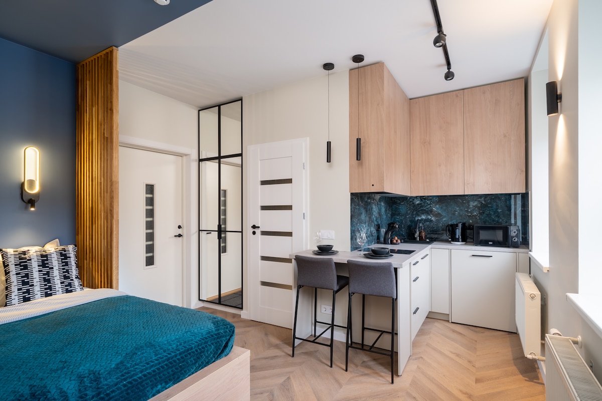 To skrivališče v Rigi je svetlo, elegantno in polno osebnosti ter združuje umirjene gorske odtenke, mehko svetlobo in tople podrobnosti. Popolno za počitek ali delo – uživajte v jutranji kavi ob oknu ali pa se sprostite po dnevu, preživetem v mestu. Občutite mir, udobje in čar kraja, ki vam bo resnično postal dom. Nahaja se na mirnem območju z enostavnim dostopom do središča mesta, kavarn in parkov. Premišljeno zasnovana za vaše udobje – udobna postelja, delovni prostor in vse, kar potrebujete za sprostitev in polnjenje energije za naslednji dan.