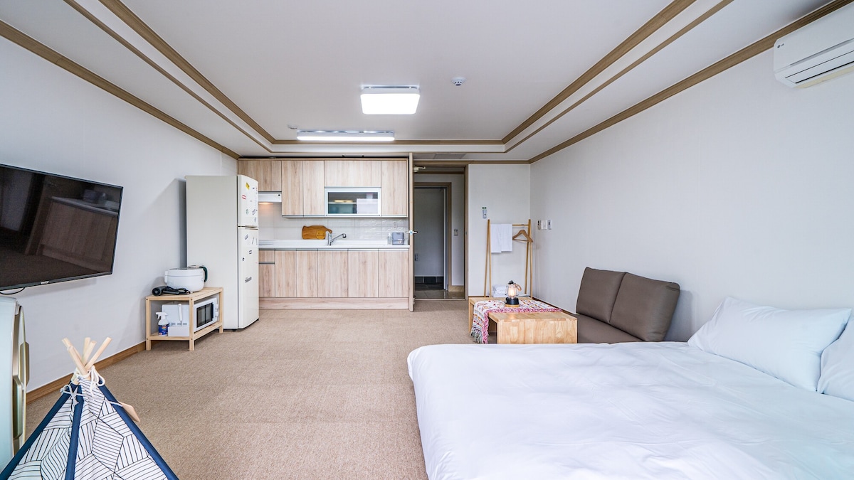 Nahaja se v Jangpyeong-dongu, ki je najbolj priljubljen na otoku Geoje. V bližini sta Samsung Heavy Industries in terminal Gohyeon. V bližini sta trgovski center Homeplus in edinstvena veleblagovnica Geoje D-Cube. Gre za dvosobno, urejeno nastanitev, kjer se lahko osvežite s prijatelji, ljubljenimi in družino. Previdnostni ukrepi Kajenje je popolnoma prepovedano (dodatni strošek čiščenja nastane pri kajenju) Ne uporabljajte požarnih nevarnih predmetov V primeru zaporednih nočitev ne bosta izvedena zamenjava in čiščenje posteljnine. Za 2 ali več oseb ali pri uporabi majhne sobe se zaračuna doplačilo.