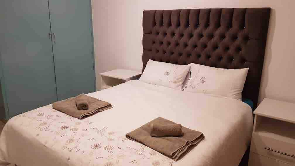 Lovely 2 bedroomed serviced apartment with a private garden, enclosed verandah, spacious lounge, modern kitchen with gas and electric hobs, washing machine, fridge, toaster, electric kettle, hot water, back up water and power in a secure complex. Guests have access to uncapped Wifi and satelite TV. The bedrooms are equipped with a king and queen bed respectively