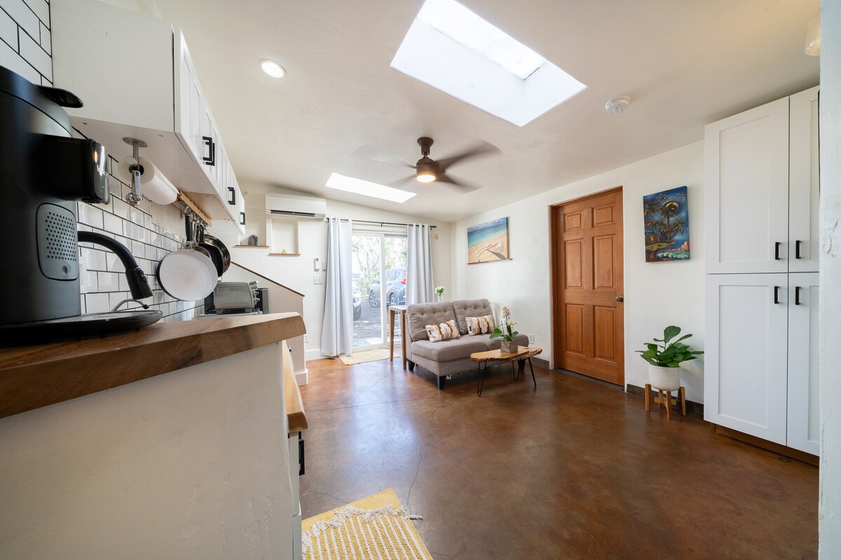 Our Sunflower suite. This cozy one-bed and one-bath is most comfortably spaced for an individual or an intimate couple. Keep it simple at this peaceful and centrally-located place. Come on in through a private and dedicated entryway into your own kitchen and living room area as you unwind from the beautiful island day. Walking distance to boardwalk along the shore. Also enjoy the walking distance to Church, Foodland, Shops, Restaurants, Nightlife, Movie theaters, Starbucks and beaches.