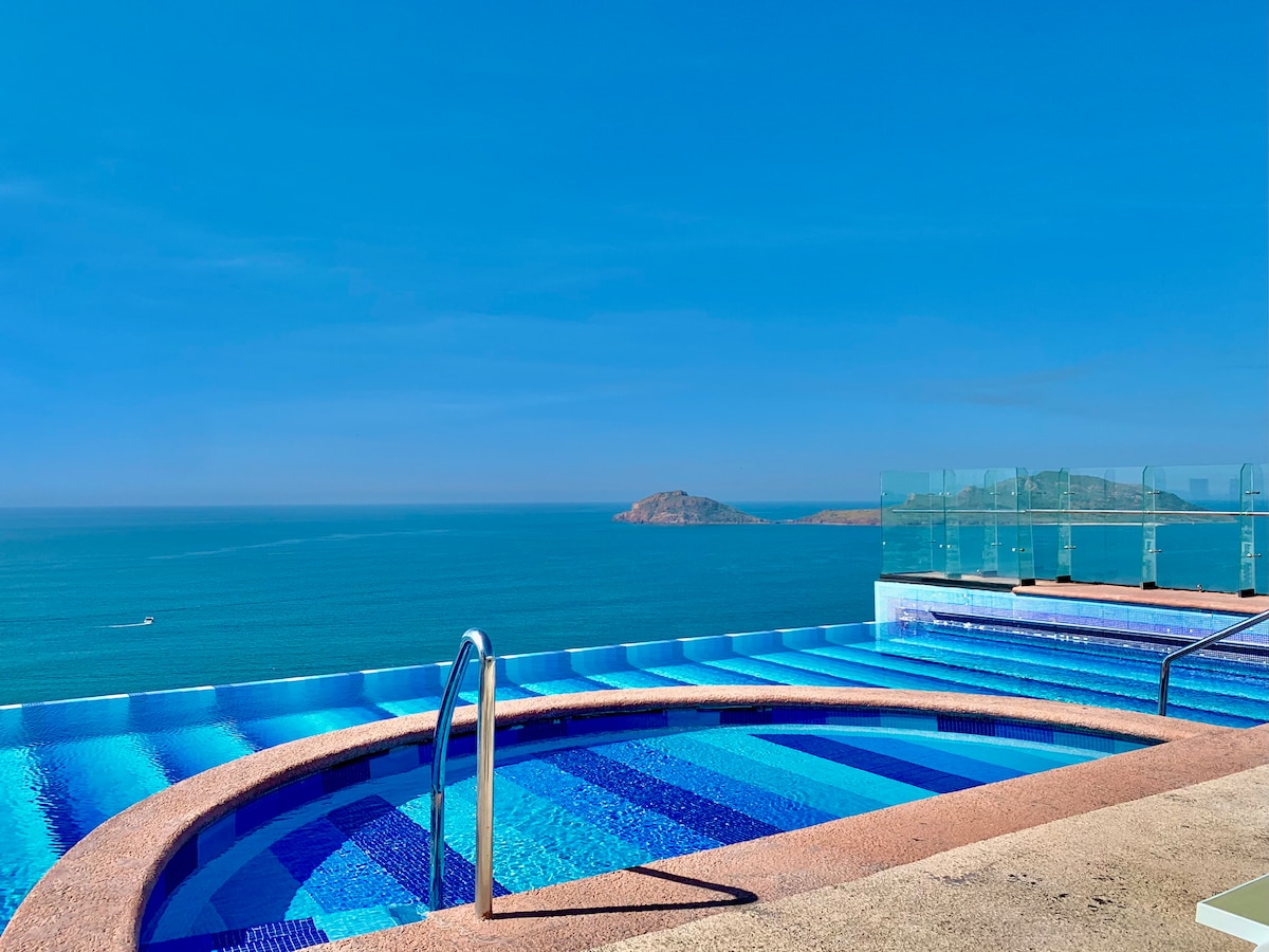 Čudovito stanovanje ob oceanu v Mazatlánu Počutite se kot doma v tem prostornem in sodobnem stanovanju z osupljivim razgledom na ocean in popolnim razgledom na slavne Tri otoke Mazatlána. Idealno za družine ali skupine do osem oseb. Ponuja udoben in eleganten prostor za sprostitev, počitek in uživanje v lepoti obale. Izkoristite našo vrhunsko opremo in med bivanjem ustvarite nepozabne spomine.