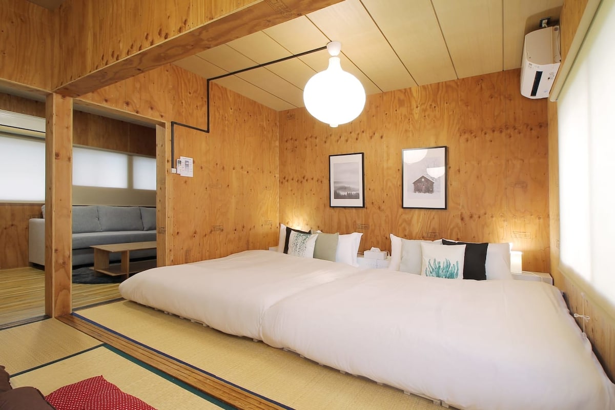 40 m2 2 nadstropji, 2-sobno stanovanje, ki se nahaja 2 minuti hoje do muzeja baseballa. 5 minut hoje od postaje Hirošima. Vsaka spalnica ima 1 zakonsko posteljo, ki lahko sprejme 4 osebe. Nahaja se v 1. nadstropju s pogledom z balkona. Vsa posteljnina je hotelski standard kakovosti. TV za zabavo. Ločena kopalnica in prostor v prahu. Pralni stroj. Idealno prenočišče v Hirošimi. Opomba: čiščenje se opravi enkrat šele po vašem odhodu.