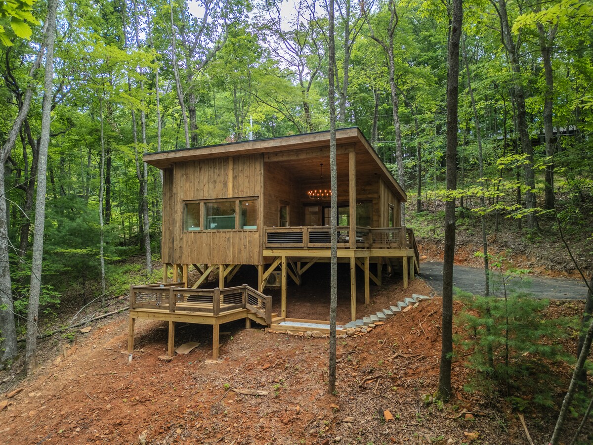 Bluff Haus je počitniška hiška v gorskem slogu v gorovju Blue Ridge. Dve palubi gledata na bujni gozd – in sta kot iz sanj v Apalahah. Naše terase so že same po sebi počitniška destinacija, saj ponujajo zunanjo dnevno sobo, masažno kad in svetleče lučke. Notranjost te nove hiše vas navdihuje in tolaži v dveh nadstropjih s podeželskim vzdušjem, številnimi ugodnostmi, brezplačnim polnjenjem električnih vozil in velikimi okni z neskončnimi pogledi na drevesa.