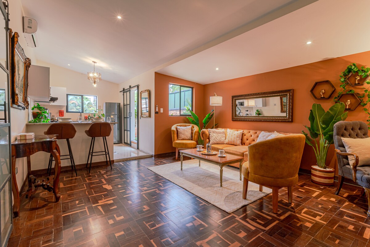 Guests love this 115 m² architectural triplex for its character, prime location, and flexibility. A one-of-a-kind vertical home with distinct atmospheres across three levels: a quiet king suite with A/C and patio, a dedicated remote-work studio, open social living with a king sofa-bed, and a zen attic for relaxation or occasional sleep. Fast Wi-Fi, washer/dryer, private parking, elevator, and 24/7 security. Walk to Provenza, Parque Lleras, cafés, parks, metro. Ideal for couples and creatives!!!