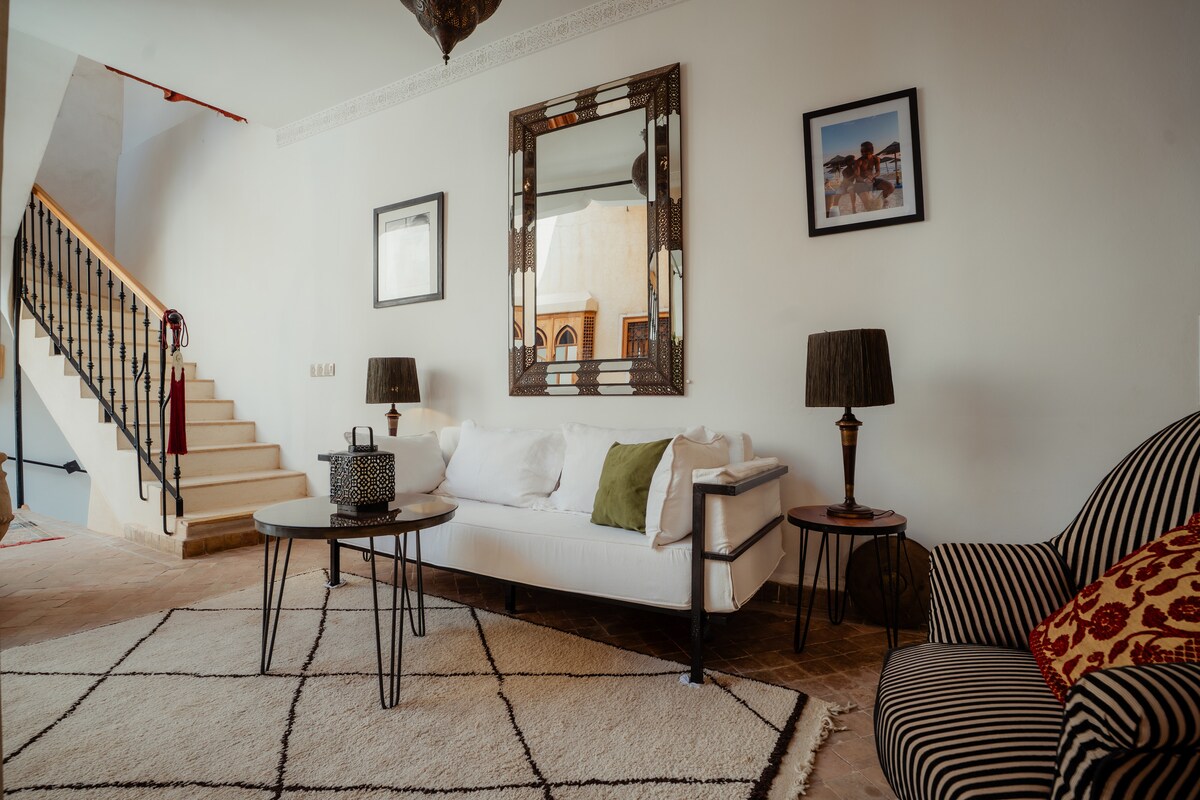 🌿 Zasebni, svetel in prostoren riad v osrčju medine. 5 spalnic z zasebnimi kopalnicami, zunanji bazen, velika terasa in igrišče za petanko. Vključeno: Dnevni čistilec Nočni oskrbnik Butler, ki je na voljo non stop za izlete, prevoze, prihode/odhode Hitra povezava Wi-Fi, klimatska naprava, opremljena kuhinja, udobne dnevne sobe. 10 minut od Jemaa el-Fne. Idealno za družine, prijatelje ali počitnice.