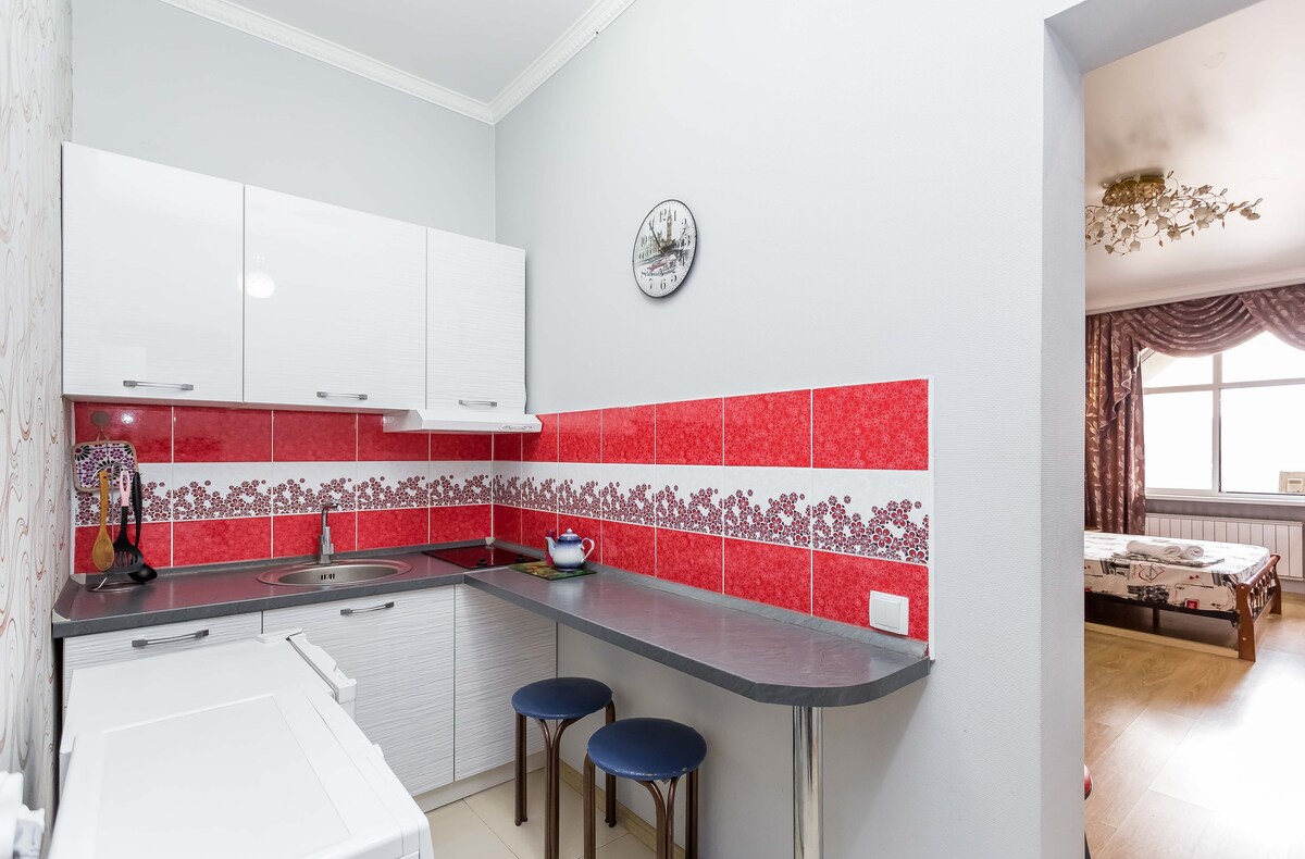 Sodobna garsonjera s površino 34 m² v zgornjem okrožju Almatyja, poleg nakupovalnega središča MEGA. Primerno za 3-4 goste: postelja z ortopedsko vzmetnico (za dve osebi) + kavč (za enega odraslega ali dva otroka) 55-palčni pametni televizor z Netflixom, Wi-Fi-jem, klimatsko napravo Popolnoma opremljena kuhinja, pralni stroj, sušilnik za lase, likalnik, jedilni pribor. Čista posteljnina, brisače. Elektronska ključavnica, prihod brez stika. Vse za udobno in udobno bivanje.