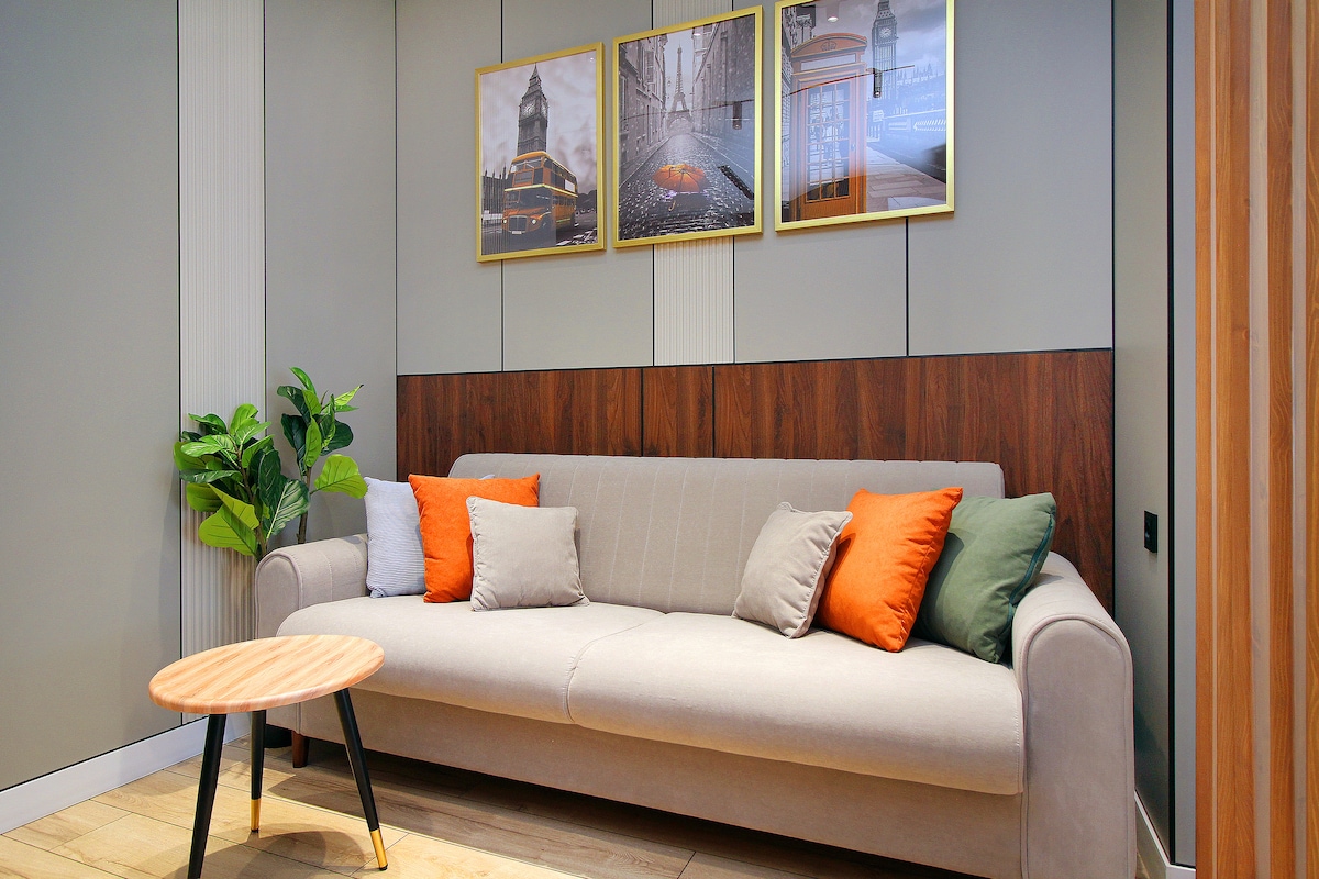 This stylish apartment with brand-new designer renovation offers you comfort and coziness. The bedroom features a wide bed with an orthopedic mattress, while the living room has a sofa bed for extra guests. The kitchen is fully equipped with an induction stove, oven, refrigerator, dishwasher, microwave, iron, and vacuum cleaner. There’s also a TV, air conditioning, and high-speed Wi-Fi. If you liked our apartment or haven’t decided whether to book yet, add it to your wishlist for easy access.