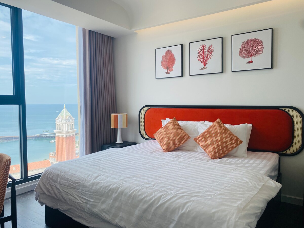 Naš apartma ima 1 dnevno sobo, jedilnico, 1 spalnico (1 zakonska postelja in kavč), 1 kopalnico in balkon. - Spalnica: Naš razgled iz spalnice je romantičen s pogledom na Grand Hill shimmering. Nudimo klimatsko napravo, nadvložek za posteljo in podstavek. - Kuhinja: na voljo so potrebni prostori za pripravo okusnega obroka. - Balkon: prostoren balkon s kompletom 2 trsnih stolov v primerjavi z 1 mizo, kjer se gostje sprostijo in uživajo v osupljivem pogledu na modro morje z okusnim obrokom.