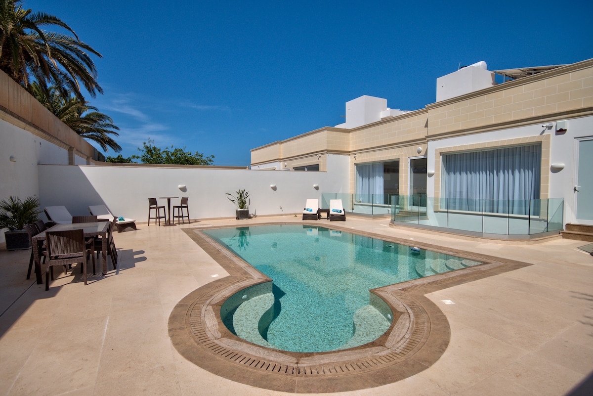 Čudovito, prostorno, družinsko in poslovno stanovanje s postrežbo s pogledom v najbolj iskani stanovanjski soseski Mellieha. Stanovanje je v celoti klimatizirano in ima 2/3-sedežni zasebni masažni bazen na svoji terasi. Gostje imajo dostop tudi do popolnoma opremljene telovadnice v isti stavbi. Stanovanje je 15 minut hoje oddaljeno od največje peščene plaže na Malti (2 minuti vožnje z avtomobilom) in razmeroma blizu vse opreme, vključno s supermarketi, trgovinami, frizerji itd.