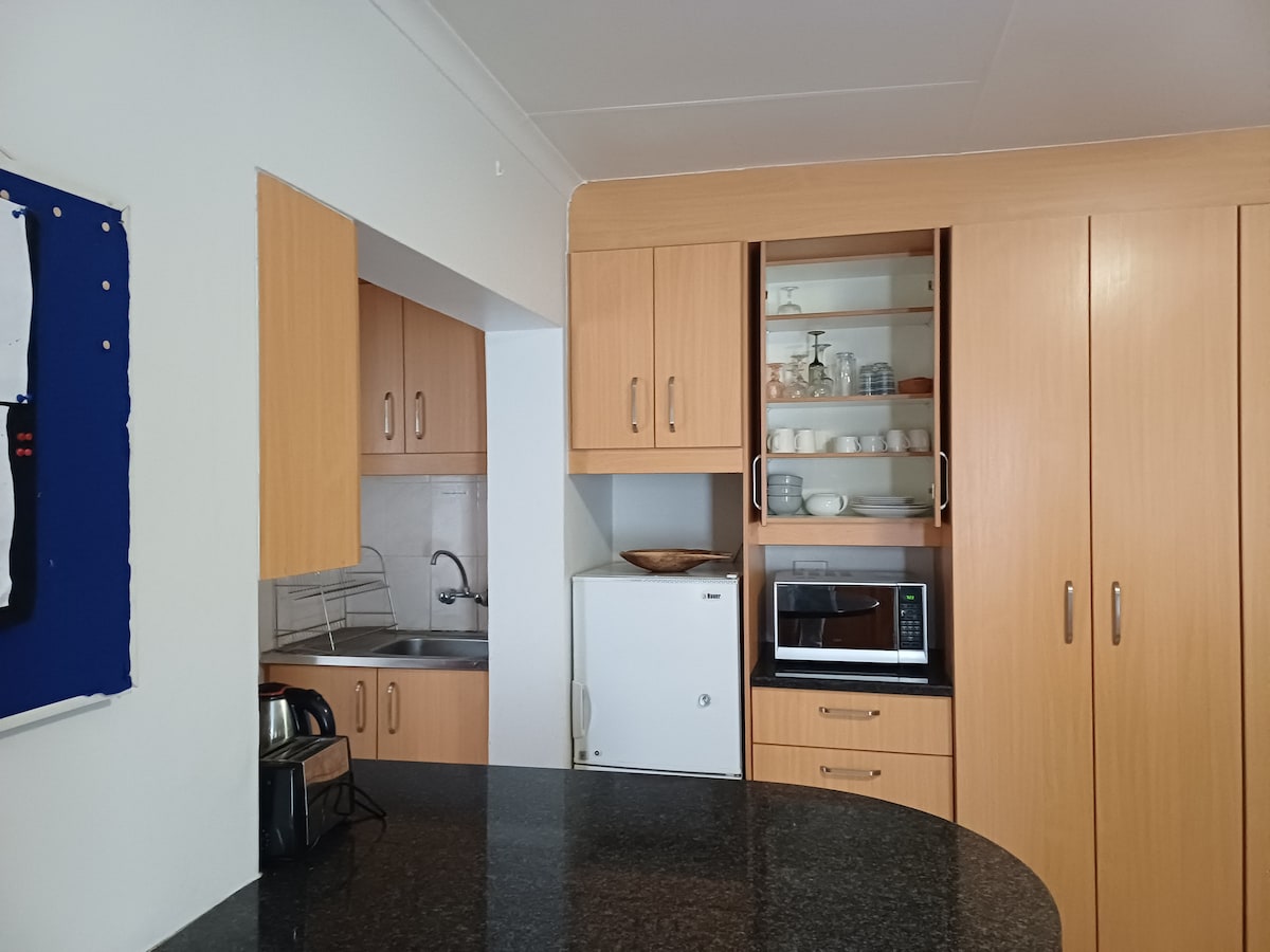 The cottage is situated next to the main house,. The private bedroom has a queen bed, built in cupboards and black out curtains. The open plan lounge includes 2 single beds, also appropriate for adults. A fully equipped kitchenette allows for self-catering. The bathroom includes a bath with shower top, basin and toilet. All linened and towels are supplied. The unit has its own patio. The pool and outside areas are available anytime and shared with the guests from the main house.