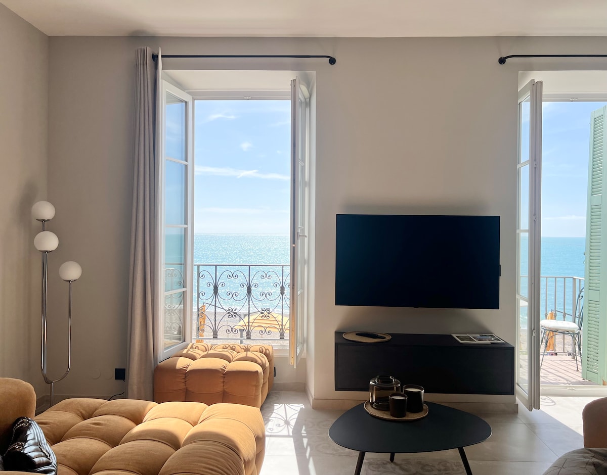 « SEAVIEWS BY JENNI MENTON »présente: Superbe 2 Pièces NEUF en Front de Mer, sur la Promenade du Soleil. 50 m2 de design,large terrasse de 18m2, vue mer comme sur un bateau de tout l'appartement. Conçu pour le confort de 4 personnes. Décoration très recherchée,matériaux et équipements haut de gamme. GARAGE FERMÉ* ASCENSEUR CLIM SMART TV INTERNET ILLIMITÉ HAUT DÉBIT ENCEINTE BLUETOOTH BOSE A quelques minutes à pied de tous les commerces et activités. Bus en bas de la résidence, gare à pied.