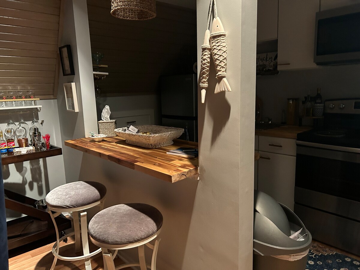 Come relax at the peaceful river house. It feels like a retreat right on the Kentucky River with a party-sized dock for easy river access. It’s a cozy cottage on stilts with a breakfast bar on the porch and swing on the patio. Be surrounded by nature and beautiful views of the river and palisades. Tuck away in seclusion just minutes away from downtown Wilmore, Asbury University & Seminary. 35 minutes or less from LEX Bluegrass Airport, Keeneland and Shaker Village. See guidebook for more info.