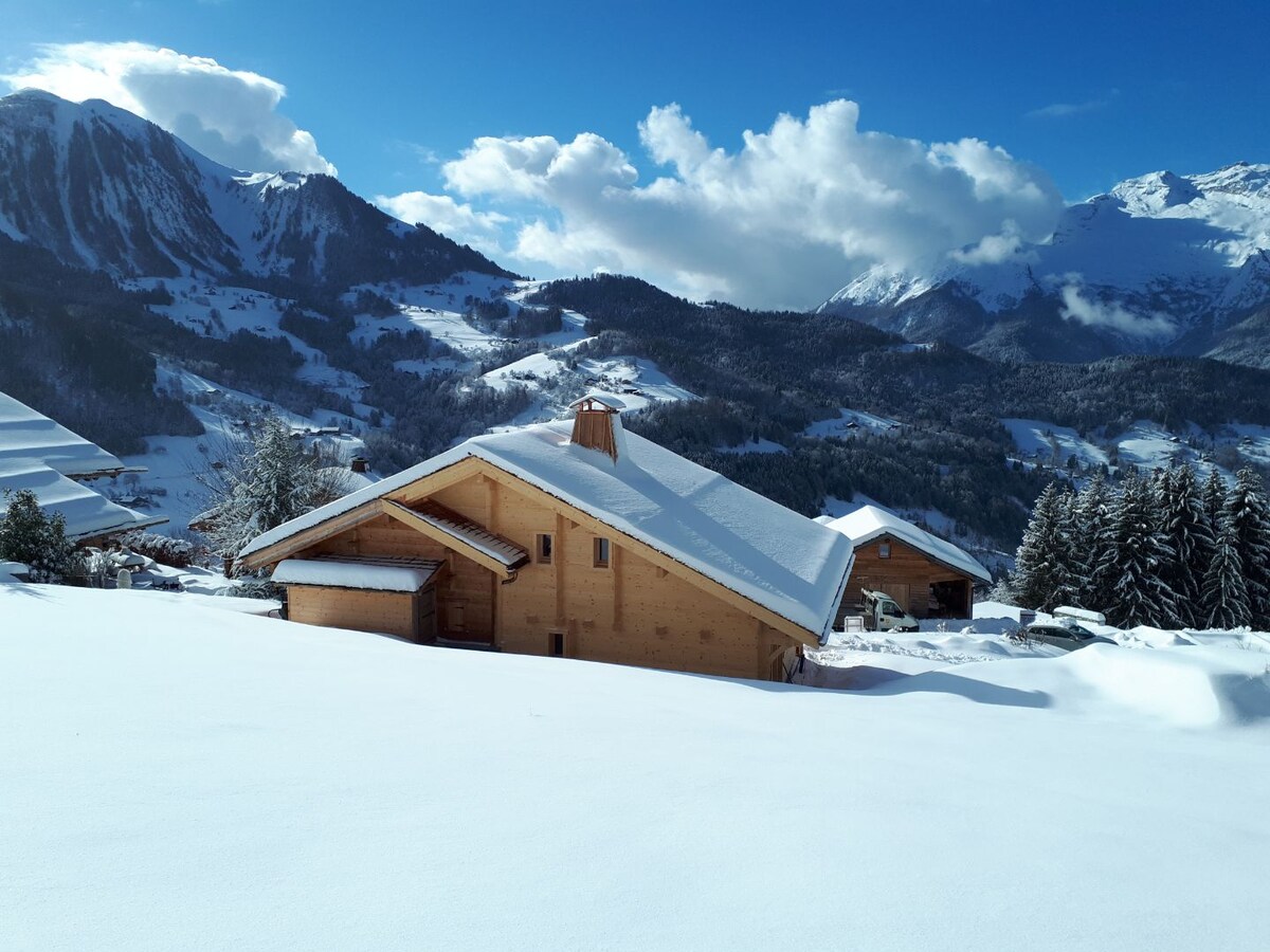 Notre chalet tout confort (classé 5* Meublé de Tourisme) se situe à 1400 mètres d'altitude assurant ainsi un enneigement optimal l'hiver. De la vaste terrasse, une vue à couper le souffle sur la chaîne des Aravis et une luminosité sans pareil tout au long de l’année. L'hiver, vous êtes à 1 km des pistes accessibles par une navette skibus gratuite juste sous le chalet. Un parking extérieur spacieux permet d'accueillir trois voitures avec pneus neige obligatoires.